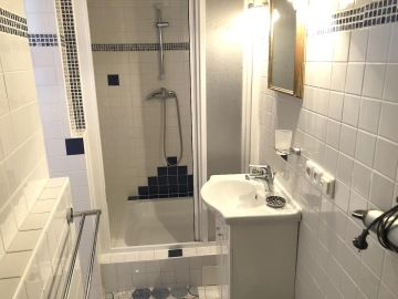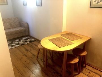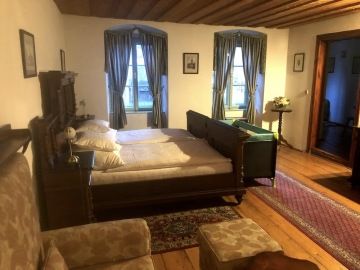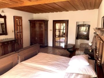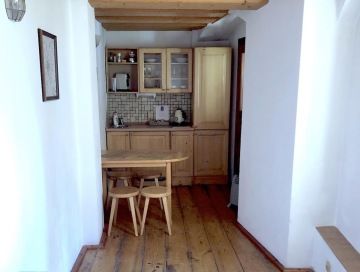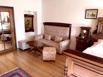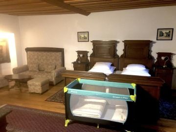 Prostorný apartmán (57 m²) v 1. patře, s výhledem na kostel. Pohodlná manželská postel. Odpočinková zóna se sofa a konferenčním stolkem. Velká šatní skříň a komoda. Jako přistýlka slouží rozkládací pohovka pro dva, je v samostatné místnosti s kuchyňským a jídelním koutem. Apartmán často využívají rodiny s malým dítětem, pro které máme k dispozici dětskou postýlku.